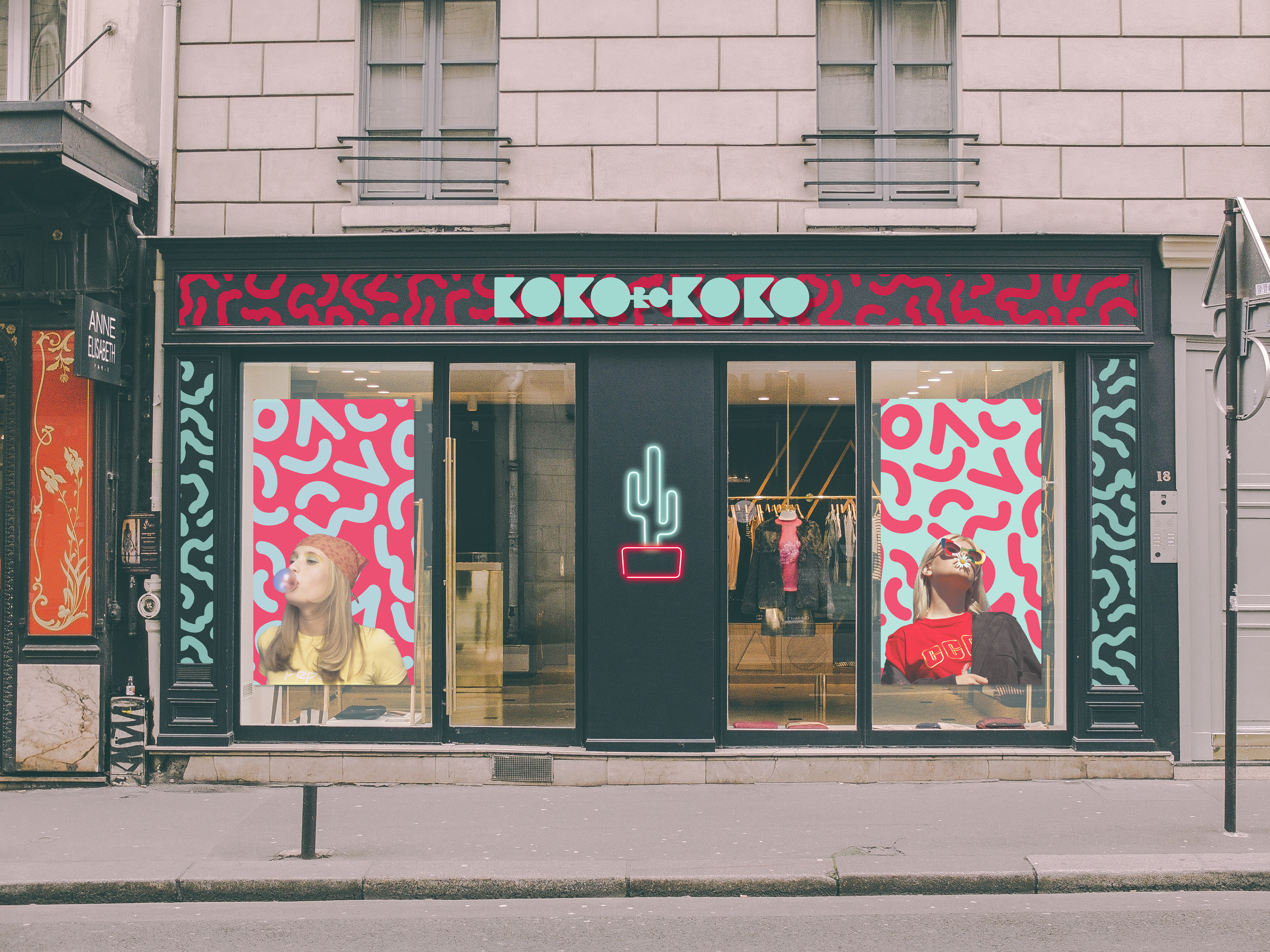 the final logo was inspired by the geometric forms found in 80s and 90s art/patterns. the decision to shorten the name from kokorokoko to koko was based strictly on the need to create a logomark that is short, simple, and memorable. I did design a variation of the logo, with the full name of the brand, for use on store signage.